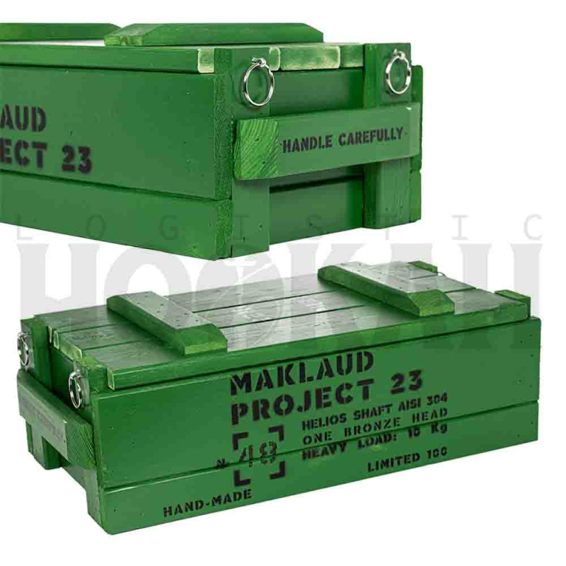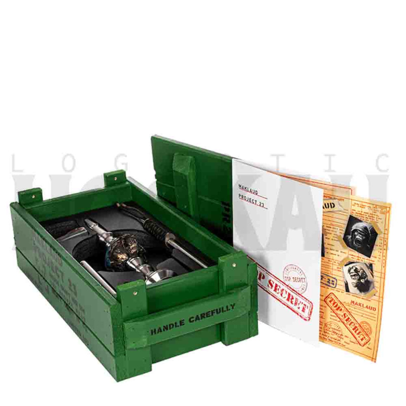 El cuerpo de la cachimba está fabricado completamente en acero inoxidable V2A, a excepción del mono que es una aleación de bronce y níquel, y cuenta con un packaging que simula una caja militar, en color verde y de madera.