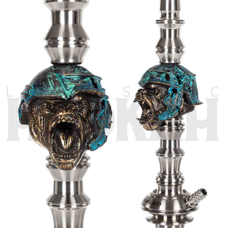 La cachimba Maklaud Helios Project 23 es una auténtica pieza de coleccionista. Se trata de una cachimba que destaca por la figura central de su mástil, que es el mítico mono Maklaud con un casco azul turquesa. Precisamente, es a través de este casco y por la propia boca del mono por donde sale la purga, lo que crea un efecto espectacular y único.